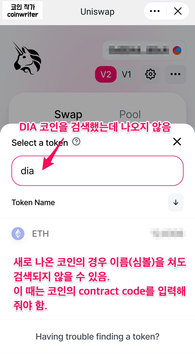 다시 유니스왑으로 와서 복사한 DIA 코인의 contract code 입력