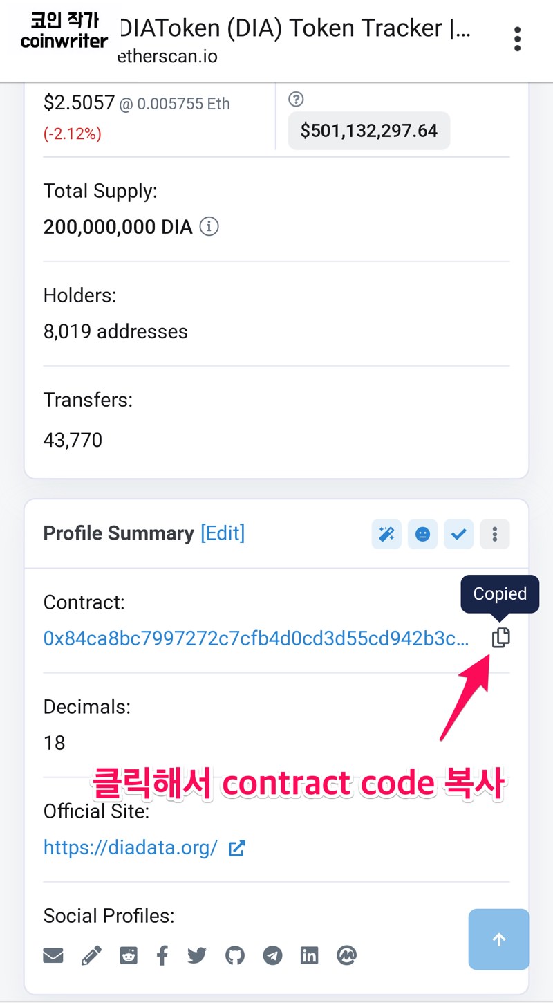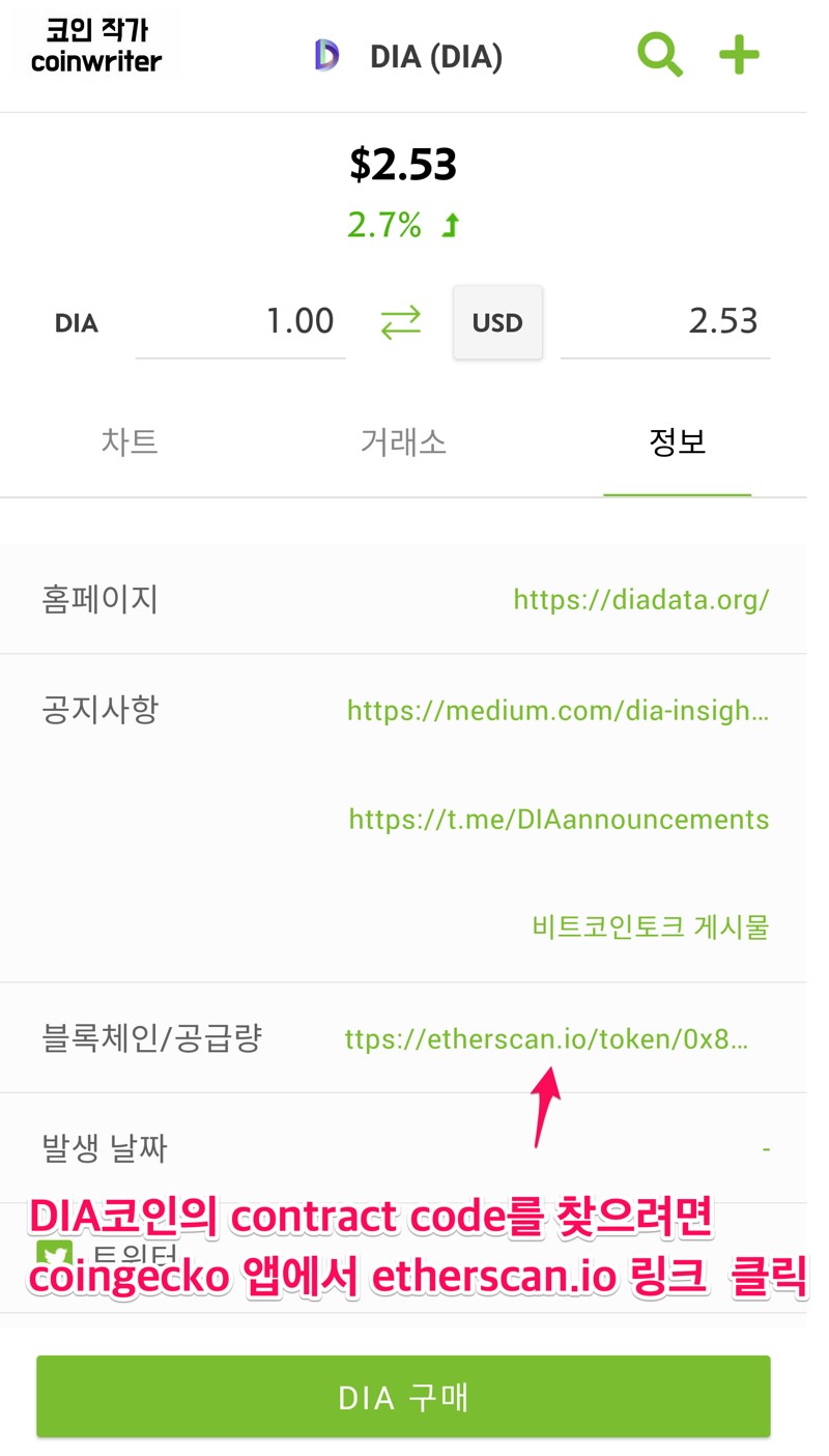Coingecko 사이트로 가서 DIA 코인의 Contract code를 가져와 보겠습니다.