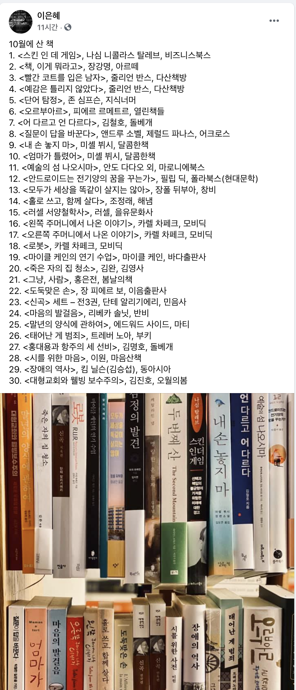페이스북을 하다가 글항아리 편집자인 이은혜님의 10월 도서 구입 목록 게시물을 보았다.