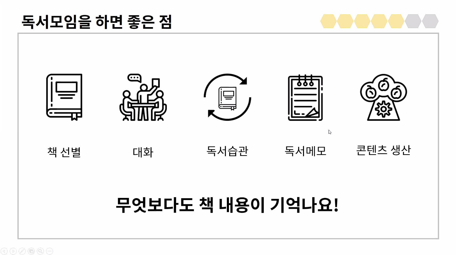 태연님의 경우도 그랬다. 11월 월간 성장판 발표를 하시면 어떻겠냐고 제안했을 때 '발표할 것이 없다'고 답을 했다. 내가 '독서모임 중독기'를 주제로 하면 좋겠다고 제안을 하니 그제서야 하겠다는 마음을 가지셨다.
