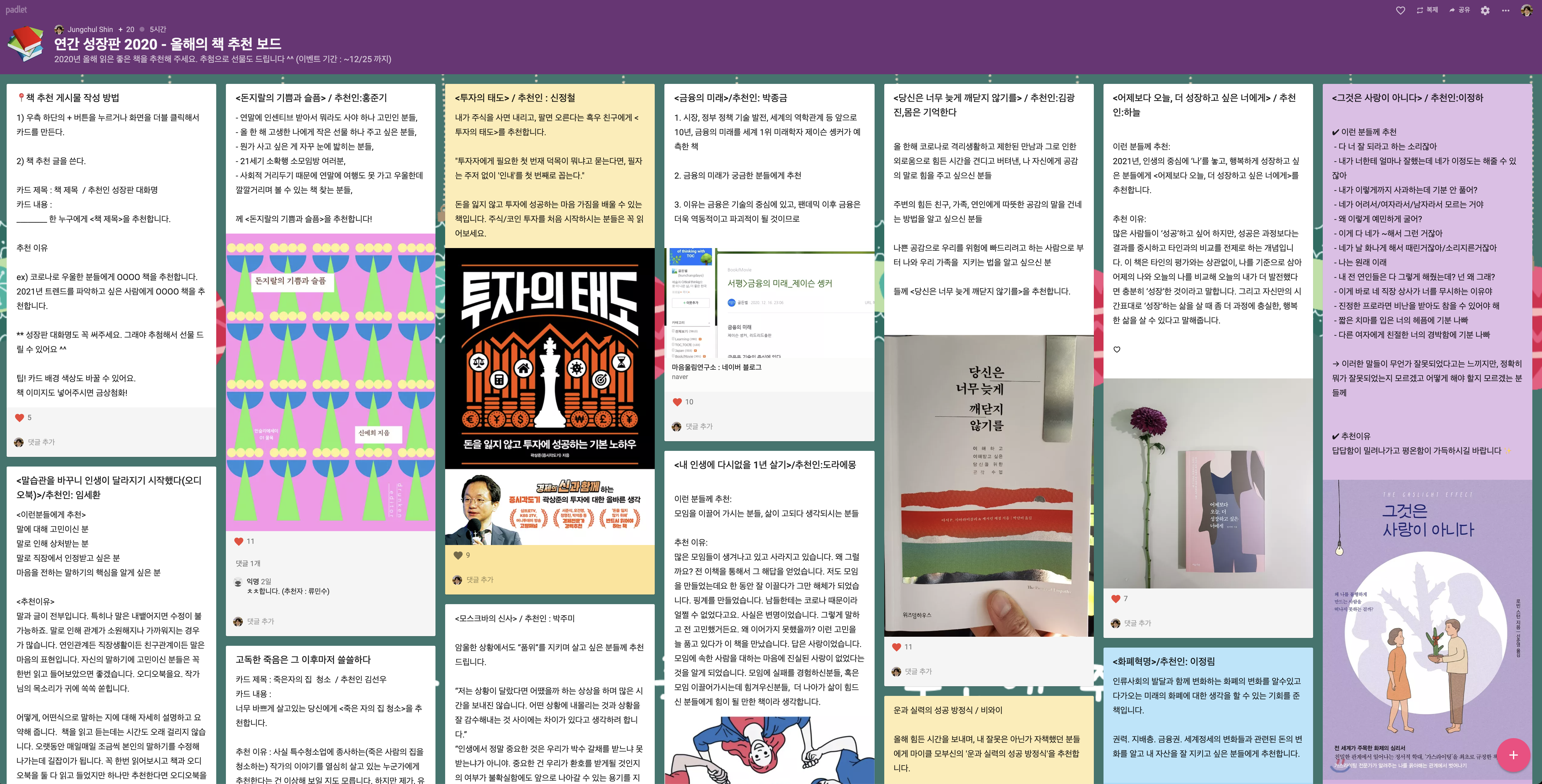 온라인 모임에서 실시간으로 의견을 받을 때만 쓸 수 있는 것은 아니다. 카카오톡 오픈채팅방에서 설문조사를 하는 도구로도 아주 유용하다. 아래는 성장판 독서모임에서 회원들에게 올해의 책을 추천받으려고 패들렛을 쓴 모습입니다. 오픈채팅방 공지에 패들렛 링크를 올려 놓기만 하면 되니까 아주 편합니다.