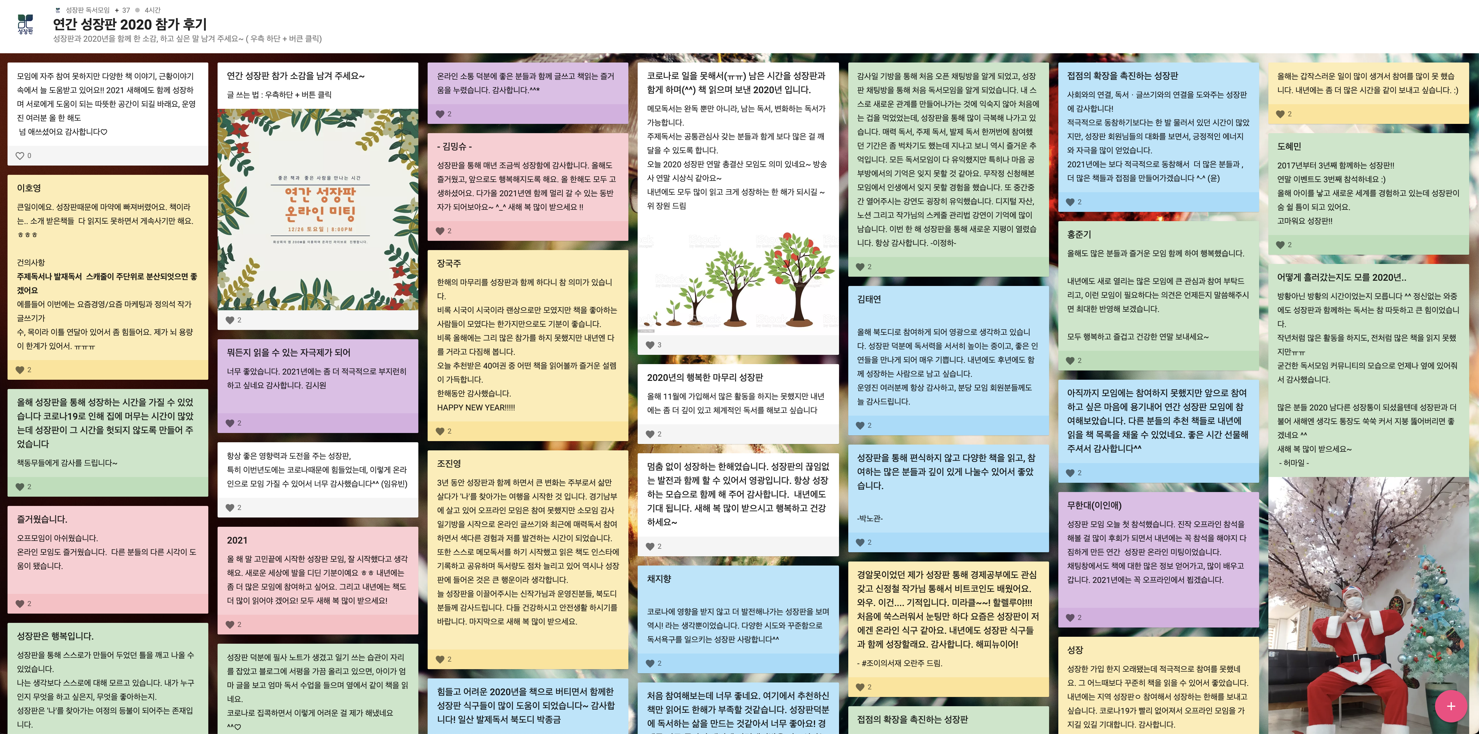 온라인으로 처음 치뤄진 성장판 송년회, 성공적으로 잘 마쳤다. 이렇게 행사 하나를 끝내고 나면 급 피곤함이 몰려오지만 빼곡히 남겨진 참가 후기를 읽으며 가슴에 행복감이 번진다. 이런 커뮤니티를 만들고 운영할 수 있음에 너무 감사한 밤이다.