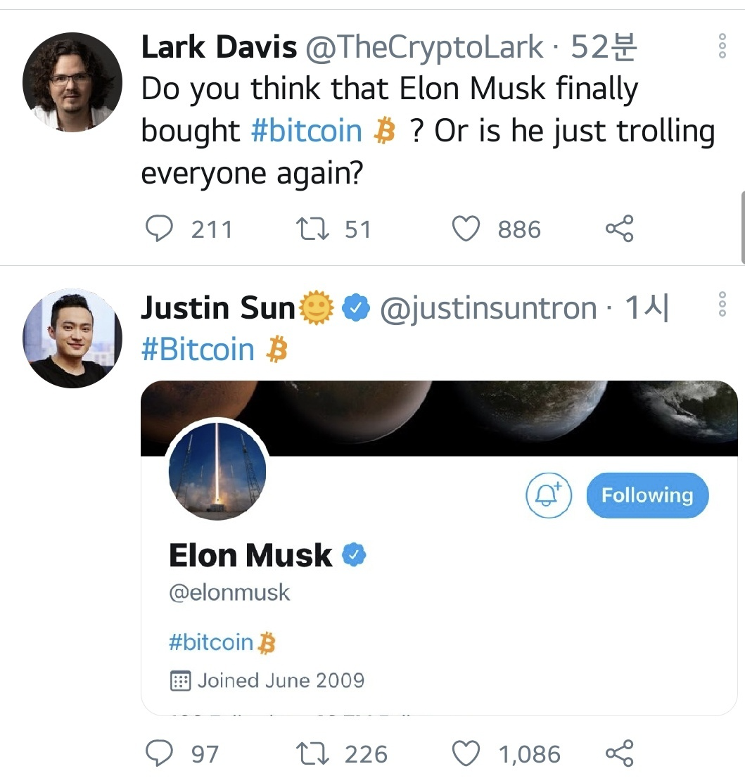 이 양대 장봉을 Elon's Candel 이라고 불러야 한다는 트윗도 나오고, 트위터의 유명인사들이 #bitcoin 해시태그 행렬에 동참했다.