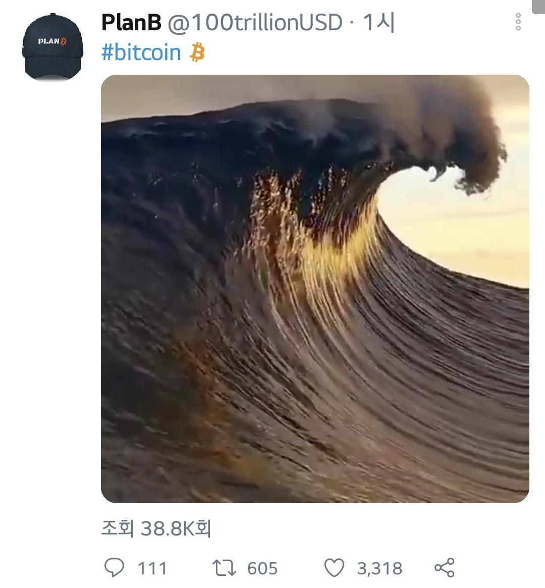 S2F 모델로 비트코인 가즈아를 항상 외치시는 PlanB 아저씨고 거대한 파도가 몰려오는 움짤과 함께 리트윗